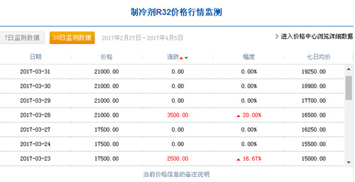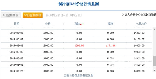 3月1日,中國(guó)R32制冷劑廠家出廠價(jià)格集中在14000元/噸,3月31日達(dá)到21000元/噸,三月份同比上漲50%;一個(gè)月內(nèi)R32制冷劑漲價(jià)達(dá)到5成。據(jù)制冷大市場(chǎng)記者了解,2月7日,中國(guó)R32制冷劑廠家出廠價(jià)格集中在12750元/噸。